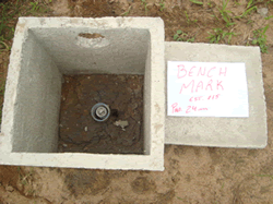O "Bench-Mark" (Marco de Referência) é obtido mediante a execução de sondagem à percussão para elaboração de controle de recalques com equipamentos de topografia.