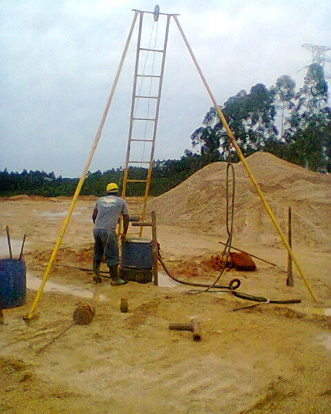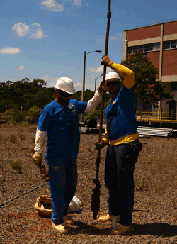 A extração das amostras foi feita com a cravação de amostrador padrão de 34,9 mm (1 3/8”) e 50,8 mm (2”) de diâmetro interno e externo, respectivamente. Anota-se o número de golpes de um peso de 65 kg, que cai em queda livre de 75 cm de altura, para cravar 30 cm do amostrador descrito acima, nas camadas de solo atravessadas. O número obtido fornece a indicação da compacidade (caso dos solos de predominância arenosa ou silto-arenosa) ou da consistência (caso dos solos de predominância argilosa ou silto-argilosa) dos solos em estudo. Para execução da sondagem é obedecido o método preconizado na NBR 6484/2001 da ABNT.